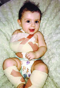 Picture of a child in a babygrow following nerve surgery.