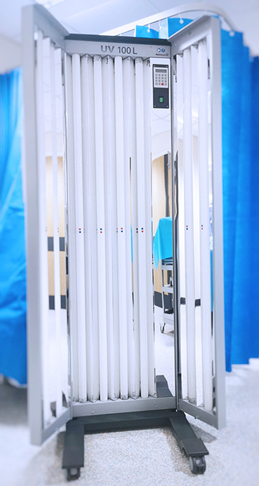 - Carry out a test dose of the light on your skin. This is a simple test which takes approximately 10 minutes, during which light is shone on a small area of your skin. This is to confirm that this is a suitable treatment for you and to find out the starting time for your treatment. This will be read the following day by the nurse at your next training session.