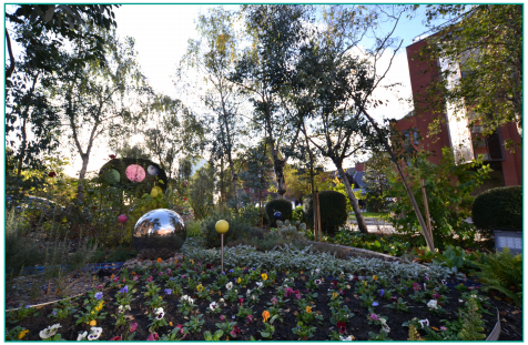 Take a seat on one of the benches and enjoy the flowers and sculpture.