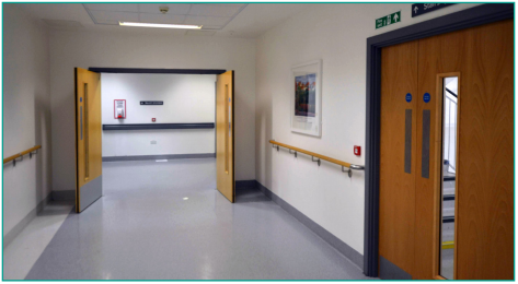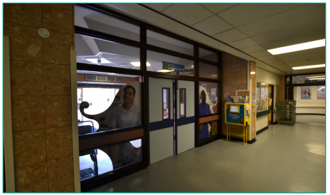 14. Head down the ramp, then continue down the corridor until you reach reception on your left. Enter reception through the double doors.