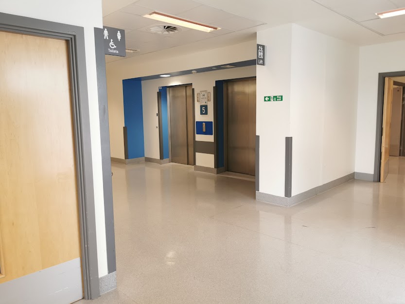 8. As you get to the end of the bridge and enter Chancellor wing, you shall see some lifts on the right. Take the lift to the ground floor.